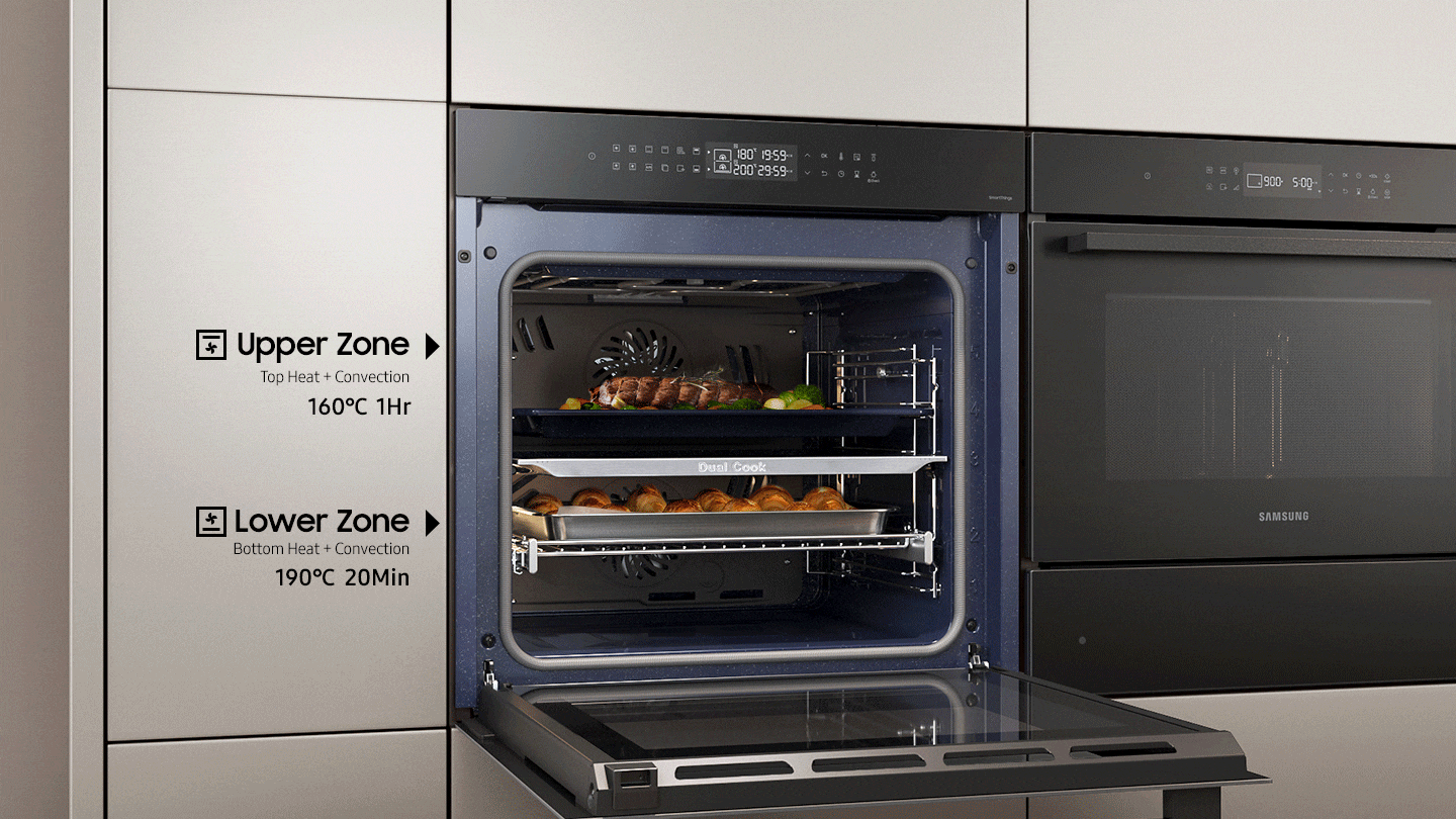Kies hoe je verschillende maaltijden wilt bereiden voor een optimale smaak. De bovenste en onderste zones werken bij Dual Cook onafhankelijk van elkaar. Gebruik de bovenkant voor kleinere gerechten, beide zones met verschillende instellingen voor verschillende smaakvolle gerechten of de hele oven voor grotere gerechten.
