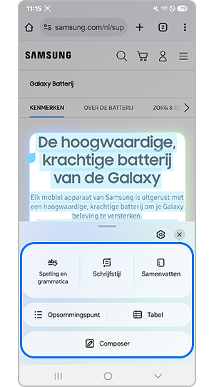 - De beschikbaarheid van Galaxy AI-functies kan variëren afhankelijk van het land, de versie van het besturingssysteem / One UI, het apparaatmodel en de telefoonprovider. De beschikbaarheid van sommige functies kan per apparaatmodel verschillen.