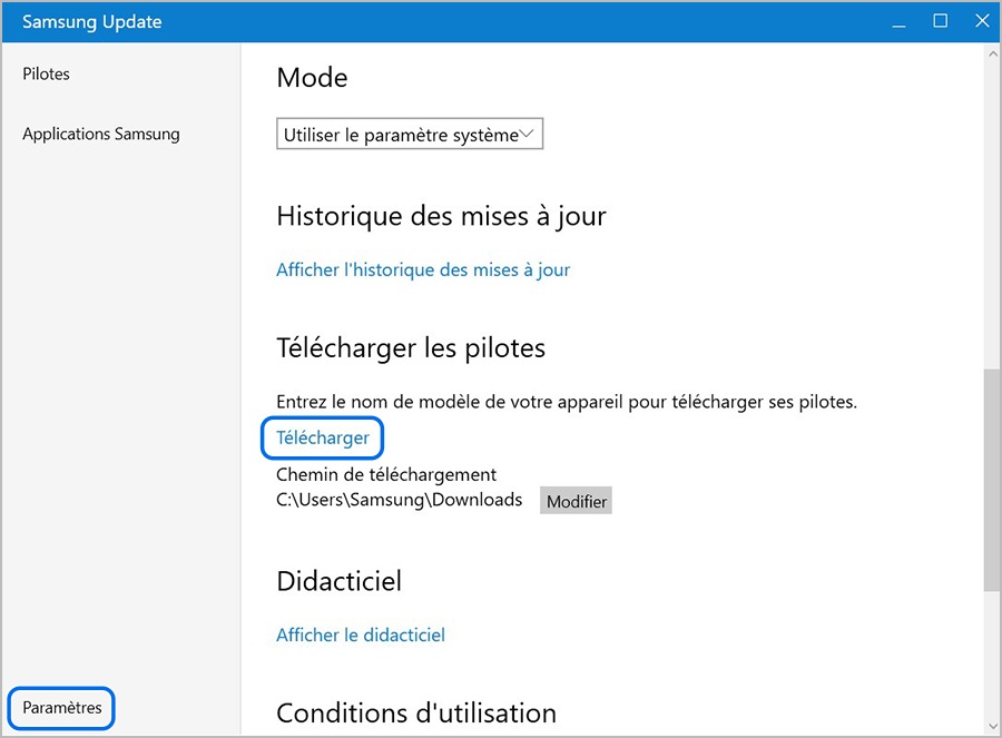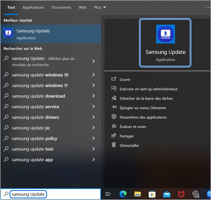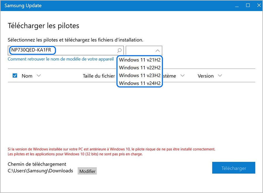 Si Windows 11 est inclus dans la version du système d'exploitation prise en charge sur Samsung Update, vous pouvez télécharger et installer les pilotes Windows 11.