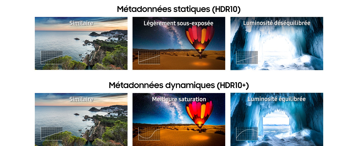 Il existe plusieurs normes HDR, dont le 'HDR10' est la plus utilisée. Récemment, on a vu l’apparition d’une nouvelle technologie, le HDR10+. Elle utilise les métadonnées* de chaque scène et offre une qualité d’image encore supérieure par rapport à la technologie HDR10. Avec le HDR10+, vous profitez d’images plus claires et plus contrastées, avec un niveau de détail optimal dans les images plus sombres et plus claires.