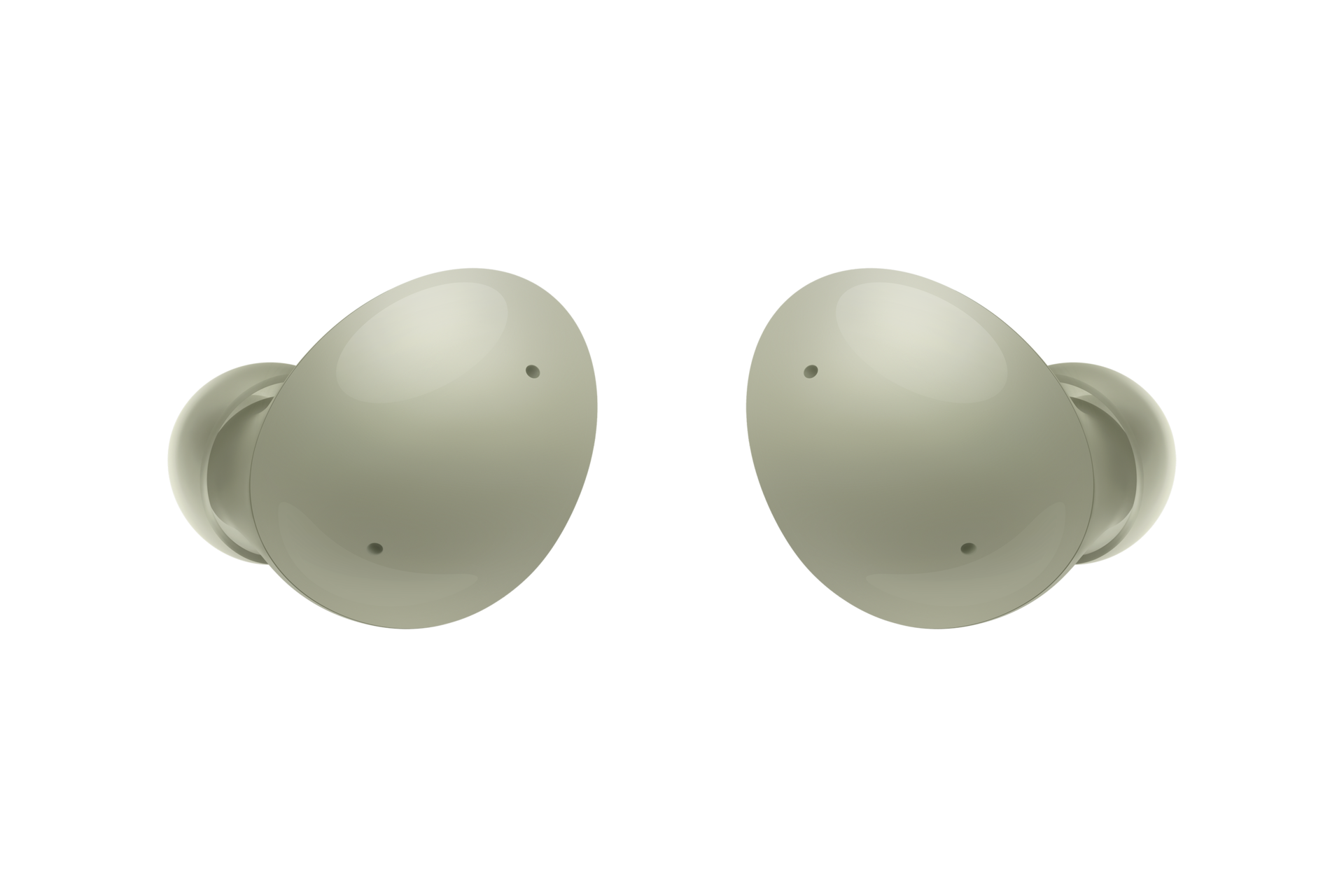 Предната част на калъфа на Galaxy Buds2 е показана отворена, с две слушалки на Galaxy Buds2, поставени вътре в корпуса. Външната част на кутията на Galaxy Buds2 е в бял цвят, а вътрешността на кутията, включително двете слушалки на Galaxy Buds2, са в маслиненозелен цвят.