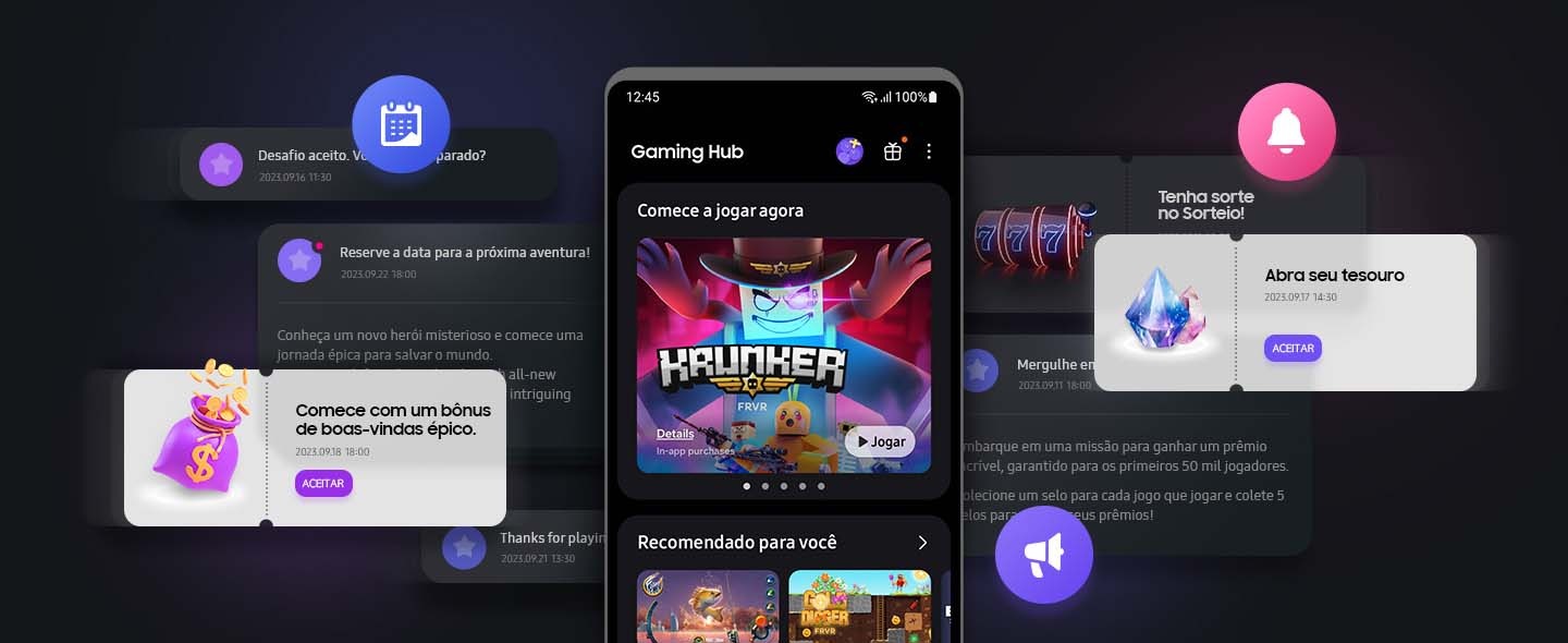 Aumente o nível dos seus jogos para celular. O Gaming Hub é uma plataforma completa para selecionar os jogos que você já adora, descobrir novos favoritos, explorar as tendências e receber benefícios especiais, tudo pensado para oferecer uma experiência de jogo incrível.