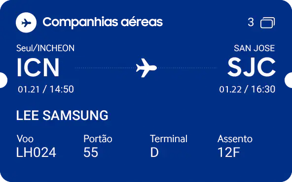 A Samsung Wallet é seu aplicativo para levar a qualquer lugar, sem preocupações, com itens essenciais: chaves, cartões de crédito e cartões de embarque. Tudo em um único local, acessível com uma única deslizada. Assim, não há mais preocupações, incômodos ou troca de aplicativos, nem mesmo para inserir sua senha.