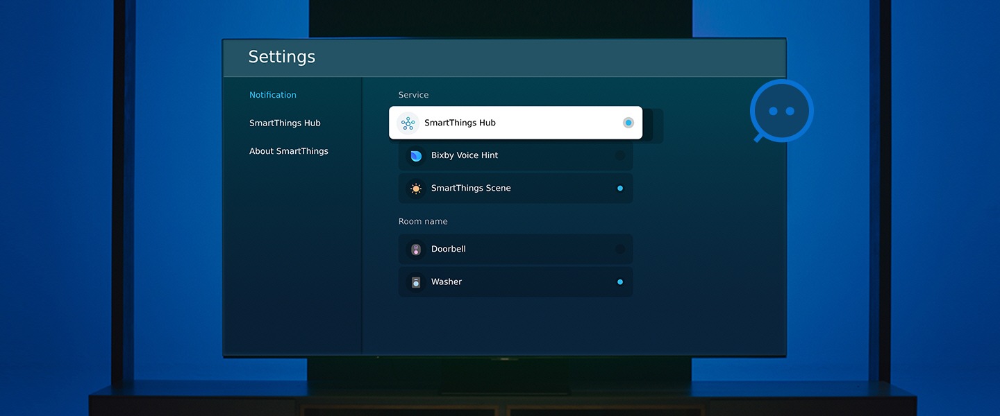*Requer o aplicativo SmartThings disponível em dispositivos Android e iOS. *É necessário ter conexão de rede ou Wi-Fi e conta Samsung. *Apenas TVs compatíveis. *A programação de disponibilidade de cada recurso pode variar de acordo com o país ou a região.*Imagem na tela simulada para fins ilustrativos
