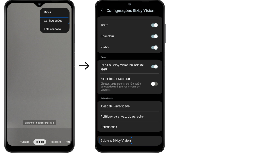 Clique em Configurações, role até o final da tela e toque em Sobre o Bixby Vision.