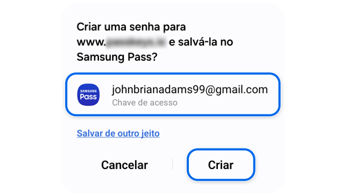 Verifique se sua Conta Samsung Pass foi selecionada. Toque em Criar > Salvar chave de acesso.