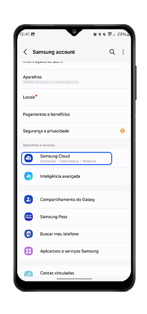 Toque na sua Conta Samsung, role para baixo na tela e, em seguida, selecione Samsung Cloud.