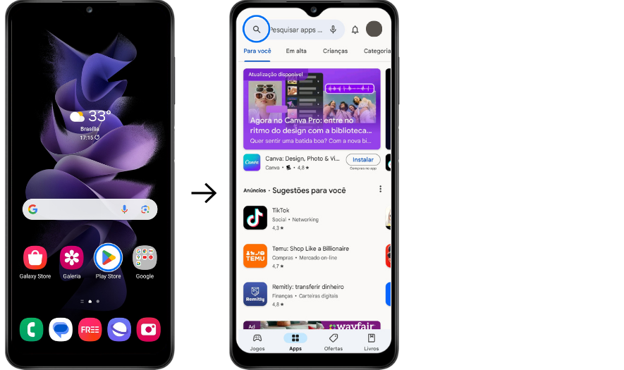 Para atualizar o software do seu Galaxy Buds, primeiro você deve baixar o aplicativo Galaxy Wearable no seu Smartphone, seguindo estes passos: