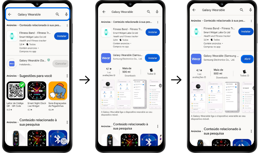 Pesquise por Galaxy Wearable e, em seguida, toque em Instalar > Abrir.