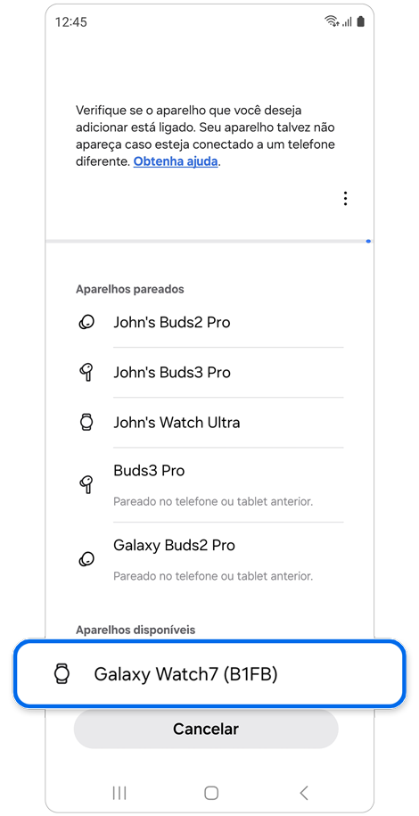 Quando um novo telefone Galaxy é conectado, o Galaxy Watch reconhecerá automaticamente o novo telefone.