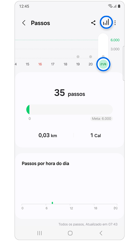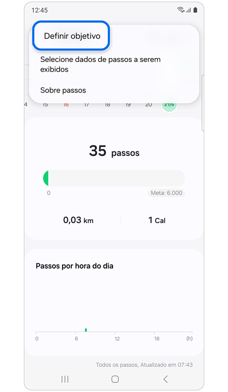 O Samsung Health usa o pedômetro em seu dispositivo conectado, como seu telefone e Galaxy Watch, para medir seus passos. Sua contagem de passos é uma estimativa que pode ser afetada por vários movimentos e onde você mantém seu telefone. A distância é calculada com base na contagem e comprimento do passo estimado, que depende de sua altura e cadência de caminhada.