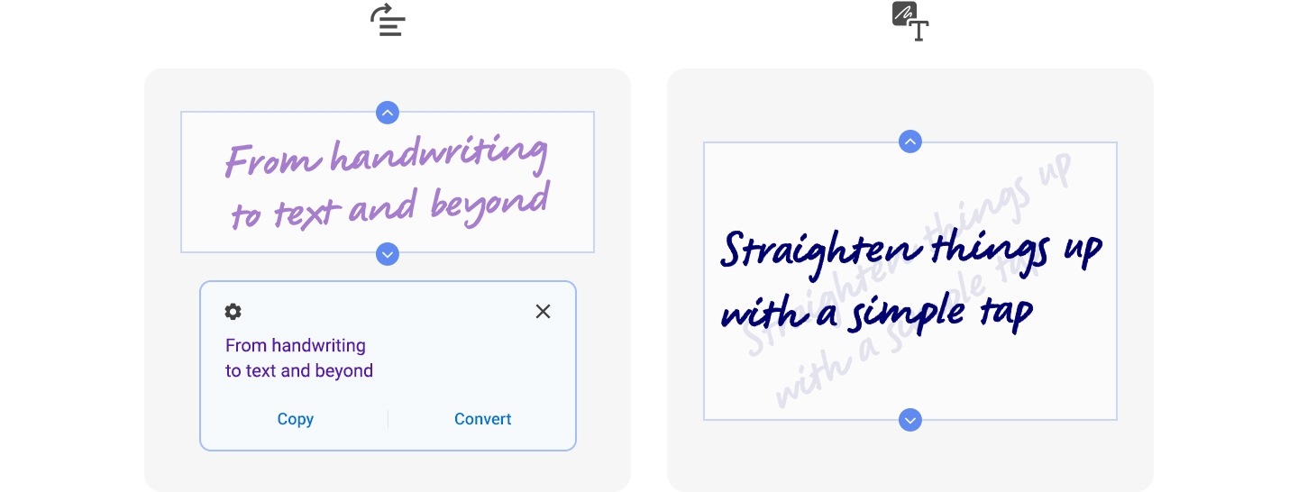 Write first and edit later with the S Pen. Jot down notes on the fly, and then straighten things up with a simple tap. Highlight the important stuff by changing text colour and thickness. Or transform the messiest of S Pen musings into readable digital text in a flash.