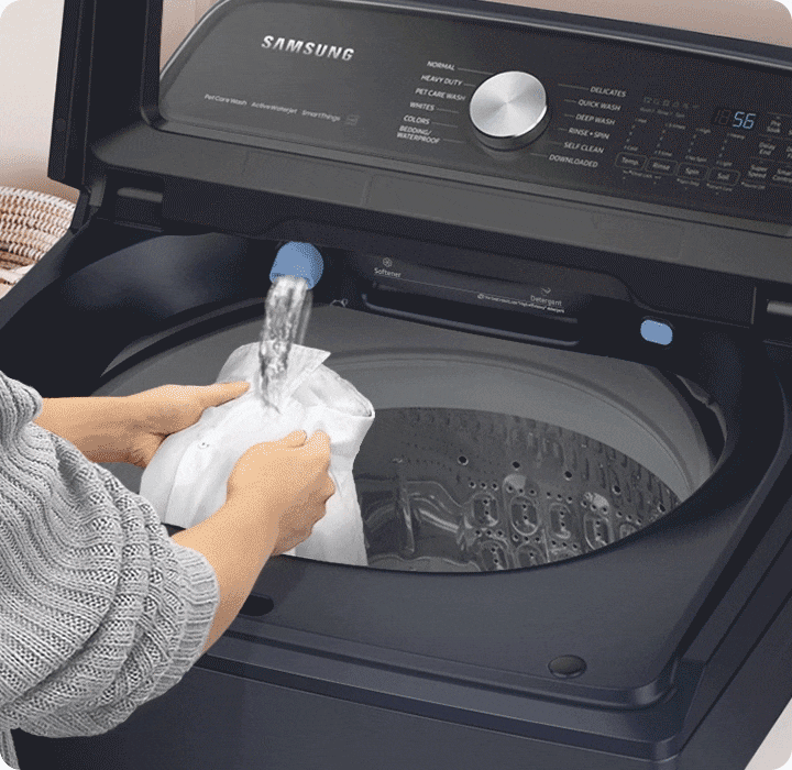 *** Tested by Hanyang University based on Samsung internal protocols. Results provided to and interpreted by Intertek and Witness Report provided on April 18th 2023. Tested using IEC A* detergent and an IEC 8 lb load containing a 10x10cm fabric specimen polluted with hair, dead skin and dust from dogs and cats. Result: removed 99% or more of the dog/cat allergens tested. Dog allergens (Can f 1) had an average input of 462.0 ± 41 ng/mL and an average output of 2.6 ± 1.5 ng/mL. Cat allergens (Fel d 1) had an average input of 67.2 ± 3.7 ng/mL and an average output of 0.2 ng/mL or less. Results may vary depending on actual usage conditions.