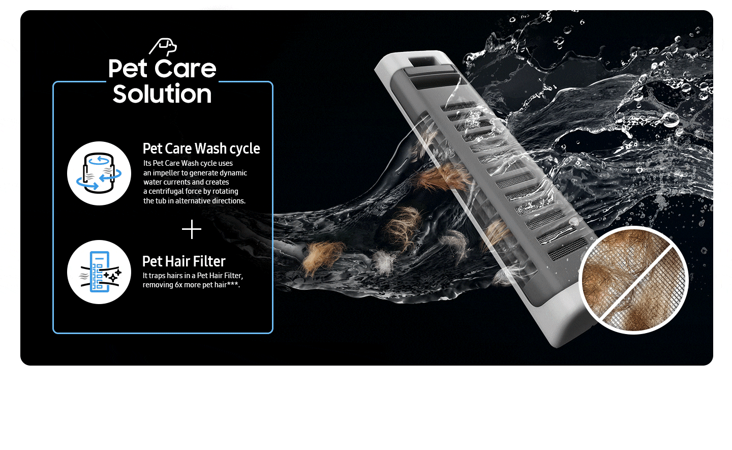 * As compared to Samsung model WA7700A. Based on internal testing on a 8 lb load containing 1 g of dog hair. The WA7700A using a Normal cycle removed 4% of pet hairs and the WA7150C using the Pet Care Wash cycle and Pet Hair Filter removed 24% of pet hairs.