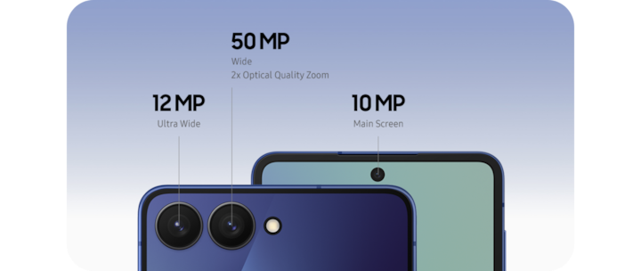 The Galaxy Z Flip7 brings the familiar awesome camera combination from the previous model, starring a 50 MP wide lens to supercharge your selfie game and a 12 MP ultra-wide lens for stunning macro photography. The 10 MP front camera rounds everything off, making sure you always look your best when snapping selfies.