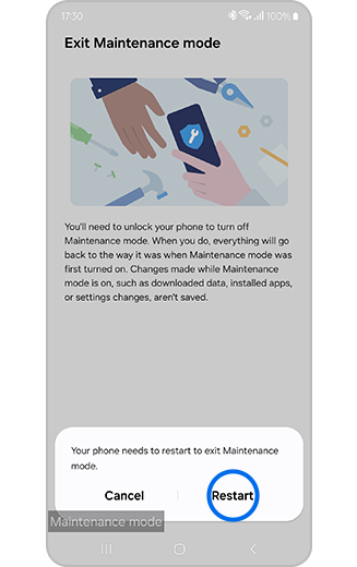 - Once Maintenance mode is active your personal data cannot be accessed, and only pre-installed apps are available.