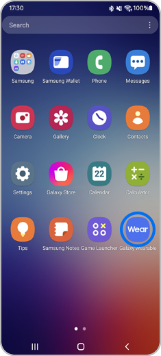 - Open the Galaxy Store or Play Store and tap the Search icon. Search for and select Galaxy Wearable and then touch the Install icon (down arrow) next to the app. Once installation is complete, tap the Play icon to open the app.