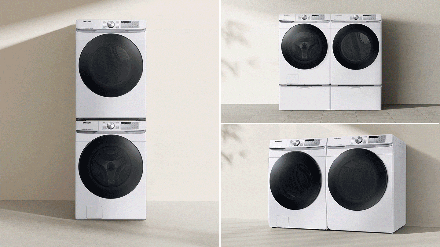 Tirez le meilleur parti de l’espace dans votre maison. La laveuse et la sécheuse peuvent être empilées verticalement ou placées côte à côte horizontalement pour s'adapter à la configuration de votre maison et à votre mode de vie ou pour libérer de l'espace au sol. La sécheuse est conçue pour être superposée* et restera bien en place.