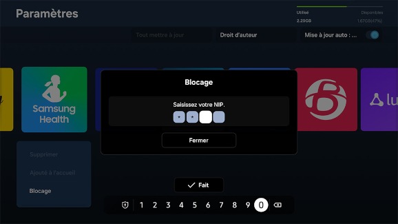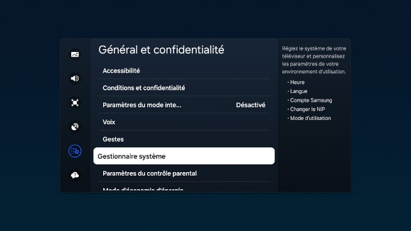Remarque : Le code NIP par défaut est 0000. Pour le modifier, allez dans Paramètres, puis sélectionnez Tous les paramètres. Accédez à Général et confidentialité, sélectionnez Gestionnaire système, puis choisissez Changer le NIP pour définir un nouveau code.