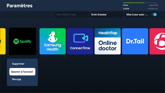 Gardez vos applications préférées à portée de main en les ajoutant à l’écran d’accueil du Smart Hub. Elles apparaîtront directement dans le carrousel des applications sur l’écran principal de votre téléviseur, ce qui vous permettra de les lancer rapidement, sans avoir à les rechercher dans le menu.