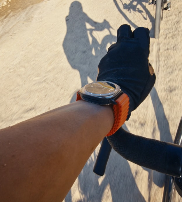 Une personne roulant à vélo sur un sentier rocailleux prend une photo de ce qui s’étend devant elle, une montre Galaxy Watch Ultra au poignet. Une autre personne fait du vélo devant elle.