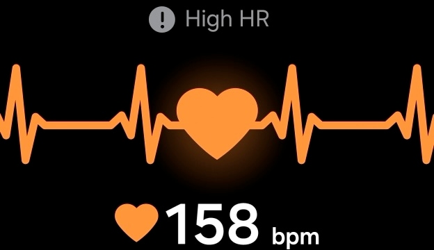 La GUI de l’ECG en cours s’affiche, de même que le bpm changeant. Au-dessus de ces informations se trouve un graphique mobile illustrant le rythme cardiaque et le texte « TA élevée » avec un signe d’avertissement.