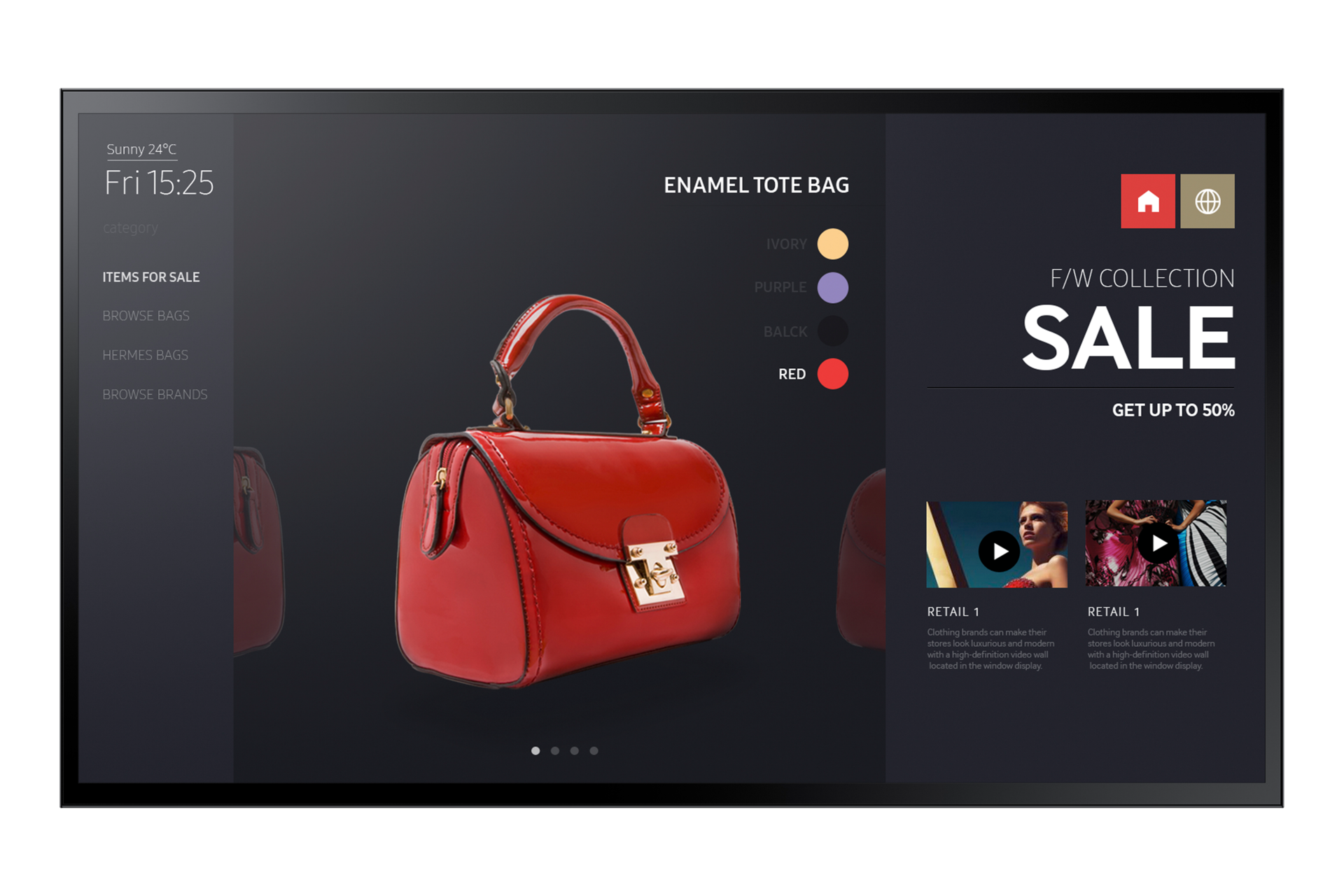 Die PMF-BC Displays von Samsung vereinen die visuelle Power von Digital Signage und die Effizienz eines Touchscreen-Displays. So werden sie den Herausforderungen im Retail-, im öffentlichen, im Unternehmens- und Personenverkehrsbereich besser gerecht. Die Displays erlauben Anwendern, nahtlos durch eine Reihe von relevantem Content zu navigieren und das ohne störende Einflüsse von Licht oder andere Umgebungseinflüsse. Das integrierte, leistungsstarke Tizen Betriebssystem garantiert PMF-BC Nutzern spannende Möglichkeiten, ansprechende Inhalte mit minimalem Aufwand bereitzustellen.