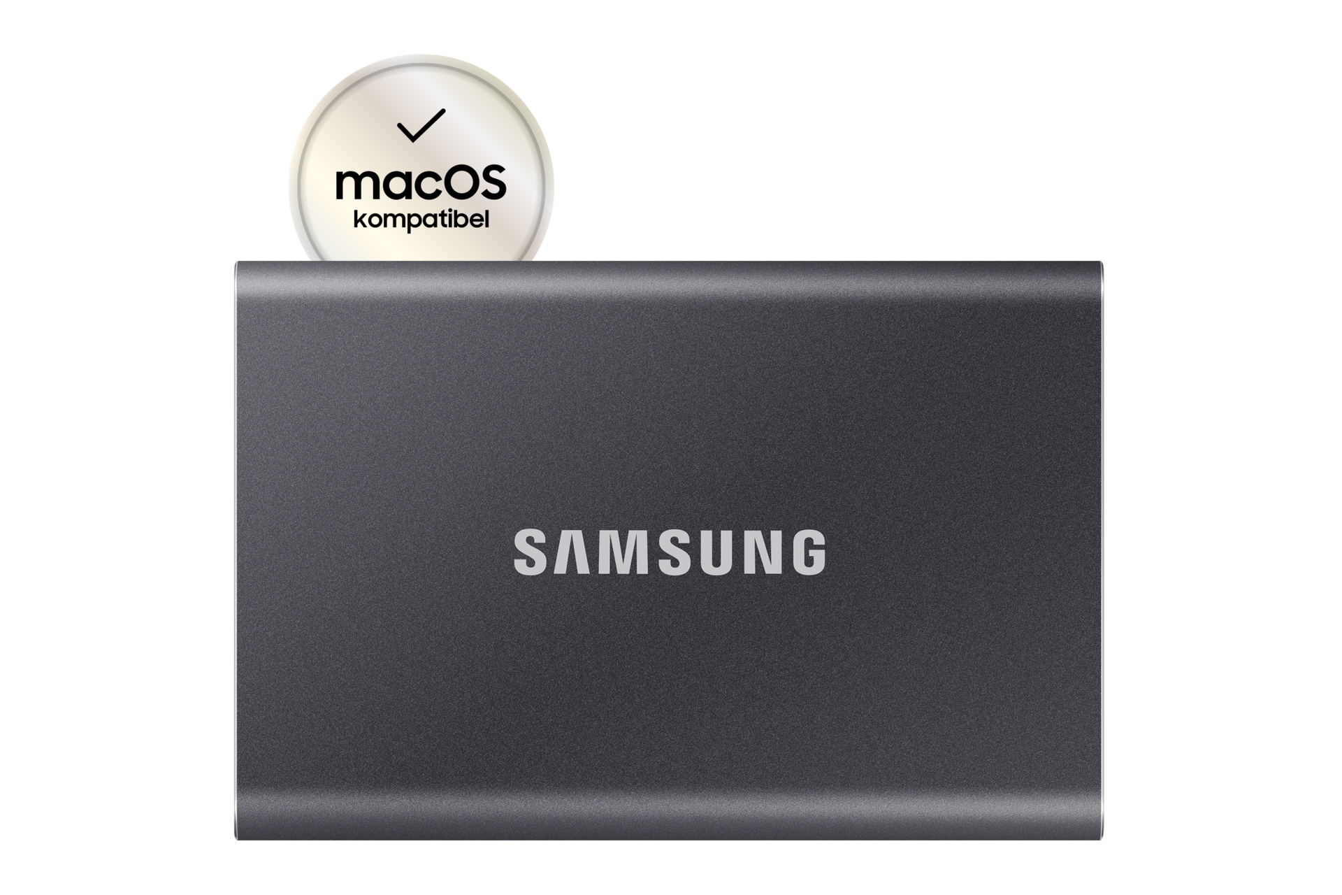 7 Die Portable SSD T7 ist abwärtskompatibel zu USB 3.0 und USB 2.0. - 6 Die Kompatibilität mit Host-Geräten kann variieren. Manche Betriebssysteme erfordern möglicherweise eine Formatierung der Portable SSD T7. Unter folgendem Link findest du eine Liste der kompatiblen Geräte: www.samsung.com/de/support