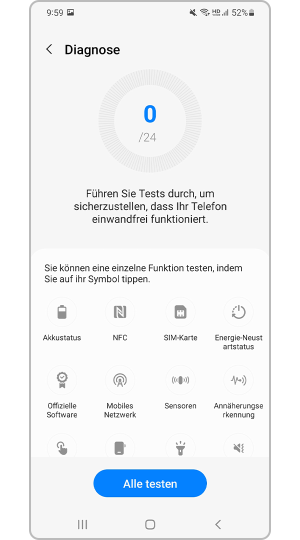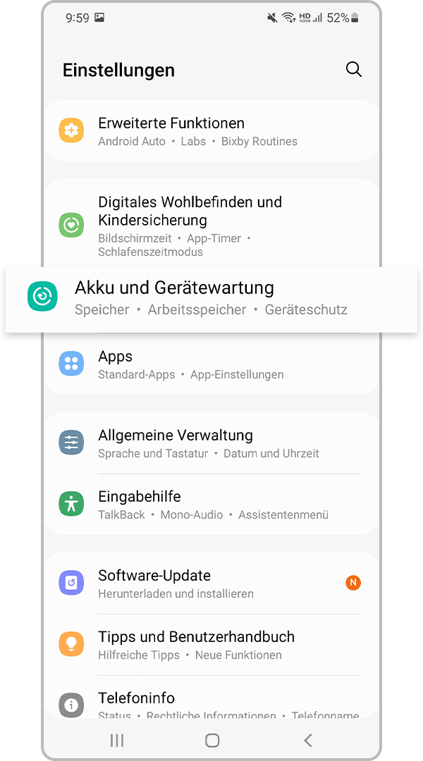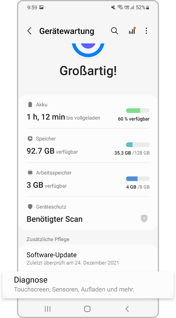 Das Display-Layout der Gerätewartung wurde aktualisiert. Die Lesbarkeit wurde durch die Verwendung von Emoticons und klaren Schriftarten verbessert. Ausserdem kannst du die Leistung deines Geräts mithilfe der neu hinzugefügten Diagnose-Funktion ganz einfach überprüfen.