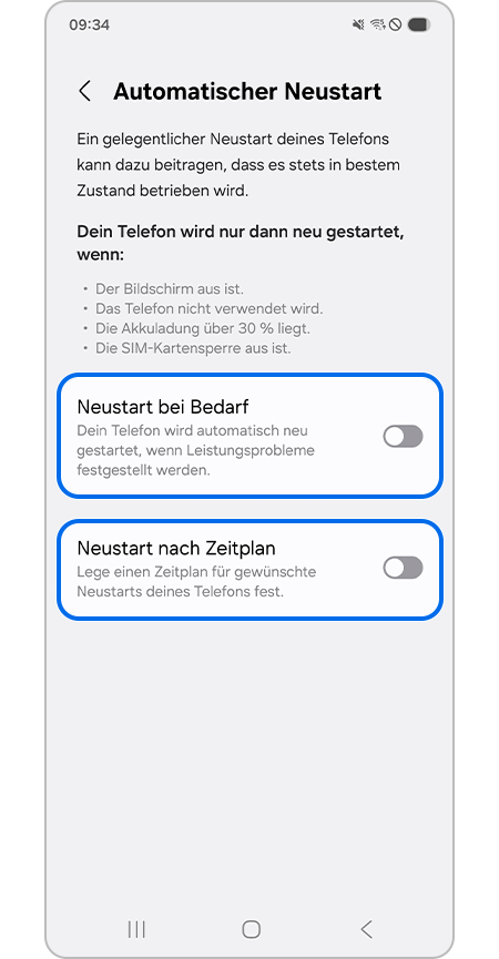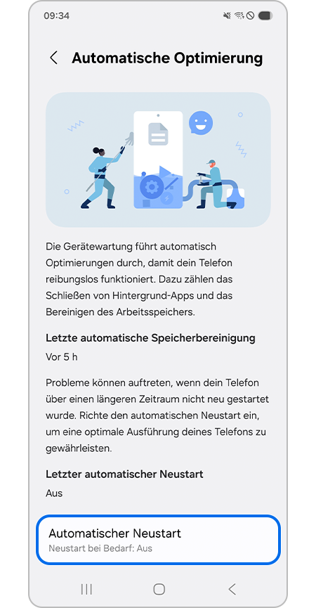 - Wenn du dein Telefon längere Zeit nicht neu startest, können Probleme auftreten. Um eine optimale Leistung aufrechtzuerhalten, empfehlen wir, den Automatischer Neustart zu aktivieren.