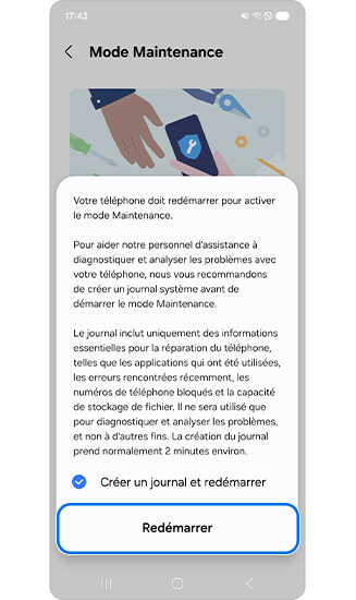 Le mode maintenance protège ta vie privée tandis que quelqu'un d'autre utilise ton téléphone, comme lorsque tu l'envoies en réparation. Cette nouvelle fonctionnalité de protection de la vie privée bloque l'accès à tes données pour que tu aies l'esprit tranquille lorsqu'il n'est pas avec toi. En mode Maintenance, tes données personnelles, y compris les photos, les messages et les comptes sont inaccessibles, et seules les applications préinstallées sont disponibles. Tu auras besoin de déverrouiller ton téléphone pour désactiver le mode Maintenance.