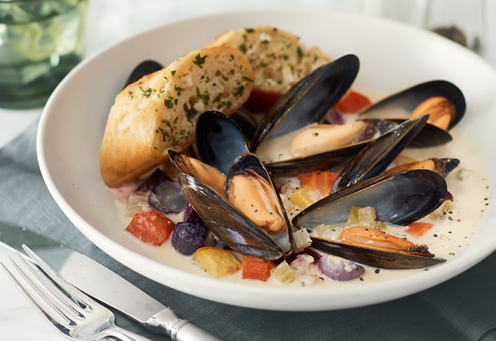 Mejillones al vapor y coloridas verduras asadas en salsa de champán con pan de ajo.