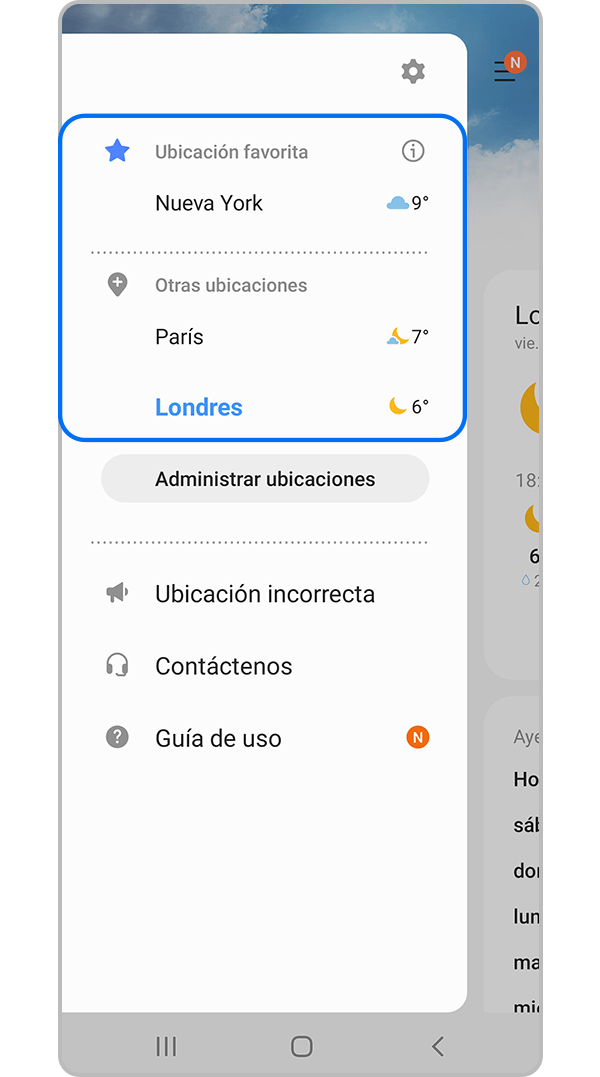 El widget del tiempo proporciona información meteorológica para tu ubicación actual de forma predeterminada. Si la ubicación no es la que deseas, o si deseas verificar la información meteorológica de otra ubicación, puedes ajustar la ubicación que se muestra en el widget de Clima. Sigue los pasos a continuación para ajustar la ubicación de tu servicio meteorológico.