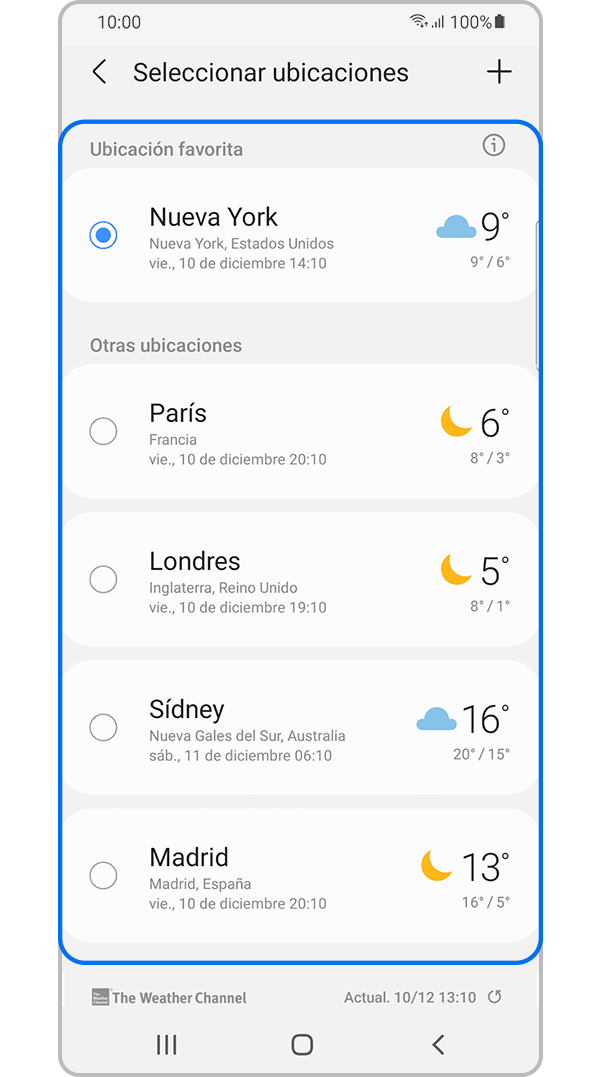 Puedes cambiar la ubicación que se muestra en el widget de Clima. Sigue los pasos a continuación para configurar una de las ubicaciones que agregó en la pantalla de inicio.