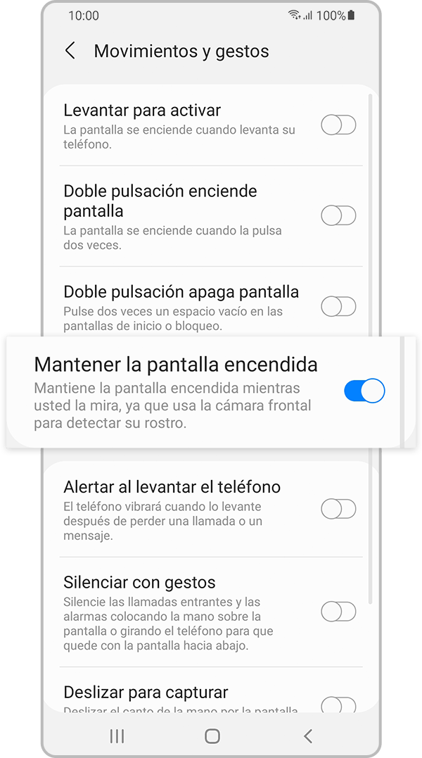 Esto mantiene la pantalla encendida mientras la miras, usando la cámara frontal para detectar tu rostro.