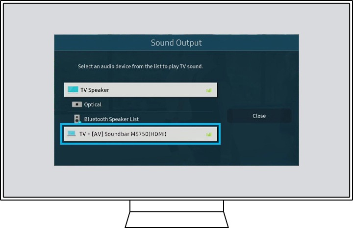 Asegúrate de que la barra de sonido esté encendida. Luego, conéctate a tu barra de sonido en el menú Salida de sonido.