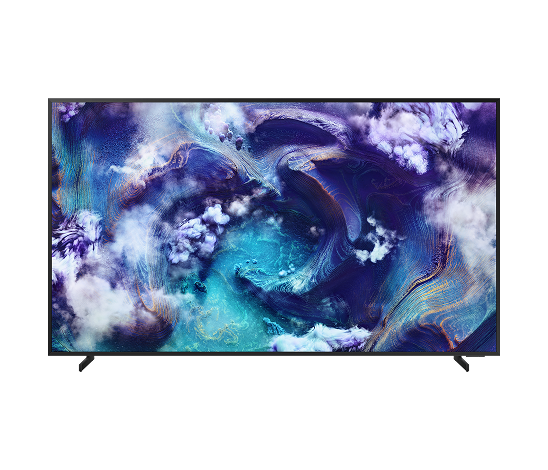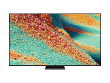Aparece un TV con un paisaje abstracto azul vívido en la pantalla. Aparecen otros cuatro TV con diseños vívidos en la pantalla, con dos a cada lado del TV original.