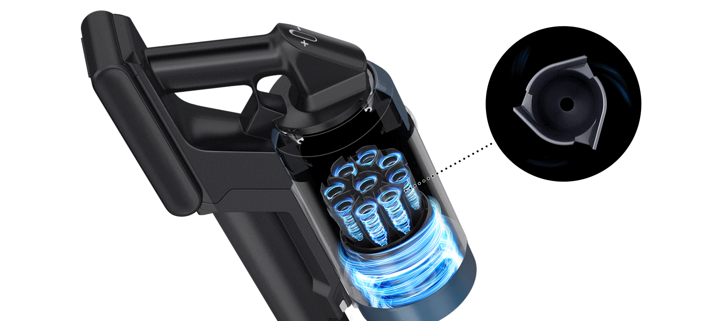 Disfrute de un aire más limpio y una potencia de aspiración extrema con la estructura multiciclónica de alta eficiencia del Jet Cyclone. Una trayectoria de aire óptima reduce la resistencia del aire y sus 9 ciclones con 27 entradas de aire minimizan la pérdida de succión. Además, atrapa higiénicamente el polvo fino que aspira el aspirador.
