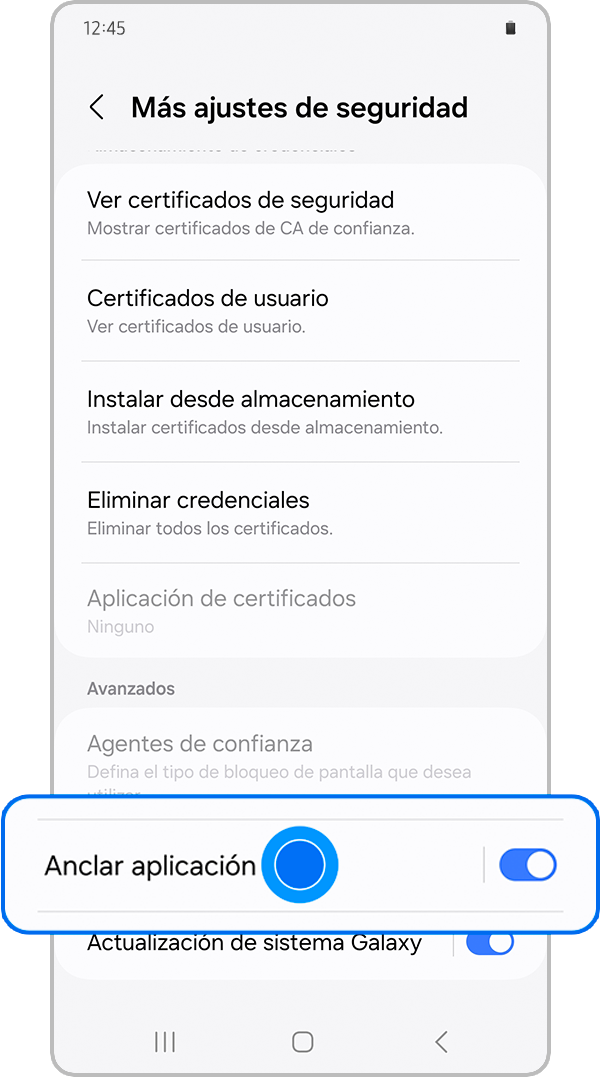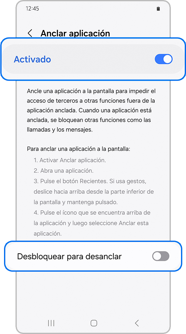 Con esta función puedes anclar una aplicación a la pantalla para impedir el acceso de terceros a otras funciones fuera de la aplicación anclada. Cuando una aplicación está anclada, se bloquearán otras funciones como las llamadas y los mensajes.