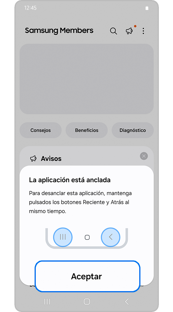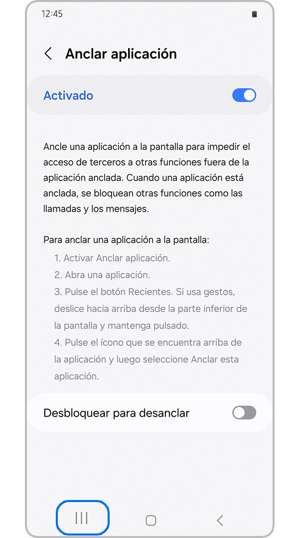 Antes de prestarle el teléfono a un amigo, puedes anclar la aplicación de tal forma que tu amigo solo podrá usar esa aplicación. Sigue los pasos para activar y desactivar: