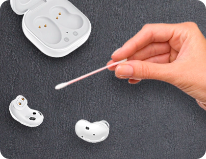 Antes de usar tus Galaxy Buds, asegúrate de limpiar y secar bien el interior de cada oreja. Úsalos solo cuando estén secos y límpialos antes de colocarlos en el estuche de carga.