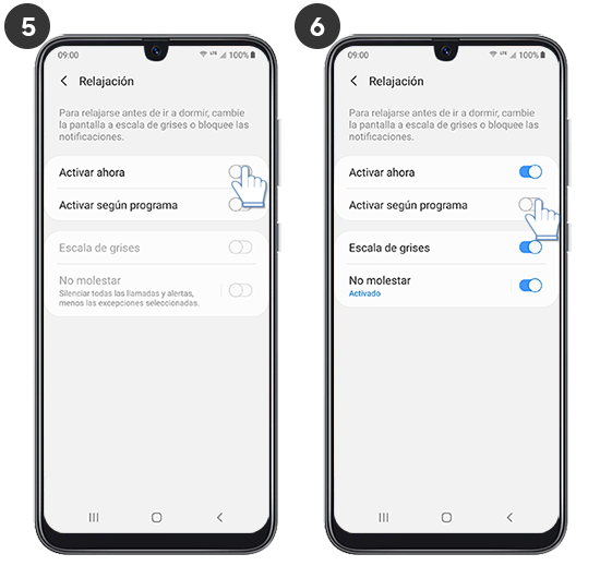 El modo Relajación te ayuda a descansar antes de dormir. Para ello, programa la atenuación de la pantalla en escala de grises y activa el modo no molestar, que silencia las notificaciones.