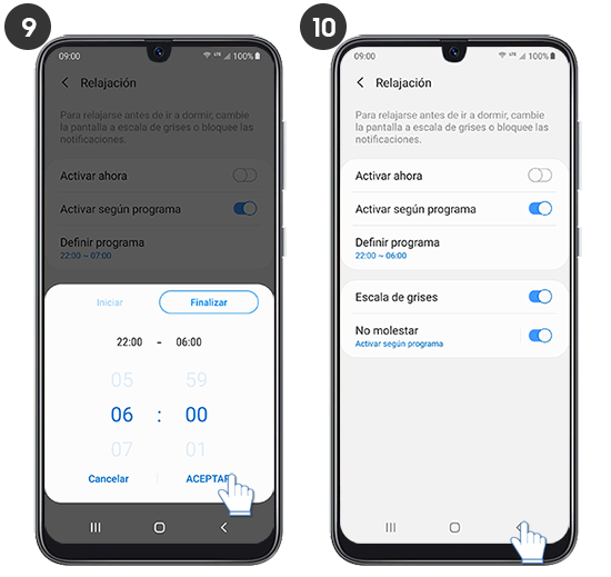Nota: El programa se activará inmediatamente, con las opciones de Escala grises y No molestar para un mejor descanso