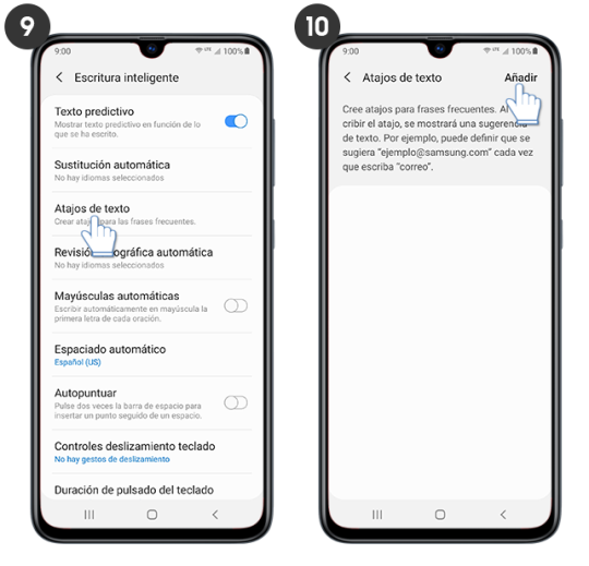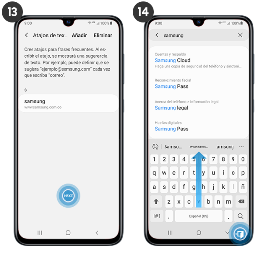 Esta función te permite crear atajos para frases frecuentes, al escribir el atajo, se mostrará una sugerencia de texto, a continuación te enseñaremos como activar esta útil función en tu Galaxy A70