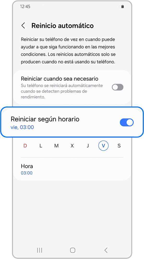 - Reiniciar según horario: Puedes establecer la hora y el día en que deseas que tu dispositivo se reinicie.
