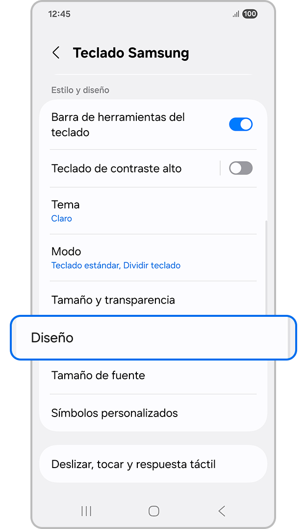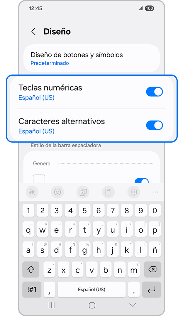 Desde Ajustes ubica y pulsa sobre Administración general, luego selecciona Idioma y entrada de texto e ingresa a Teclado en pantalla, elige la opción Teclado Samsung y toca Estilo y diseño, por último, ingresa en la opción Diseño del teclado y activa o desactiva los interruptores a la derecha de Teclas numéricas y Caracteres alternativos.