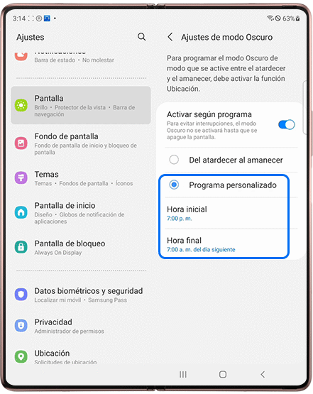 Paso 3. En los ajustes de Modo Oscuro podrás activar el programa personalizado y definir el horario en el que se activa.