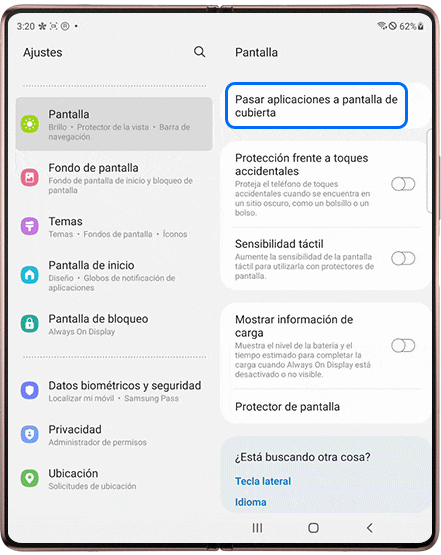 Paso 1. En los ajustes de pantalla ubica y selecciona la función Pasar aplicaciones a pantalla de cubierta.