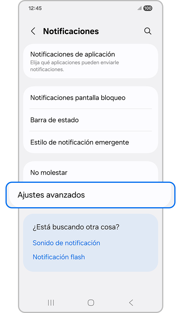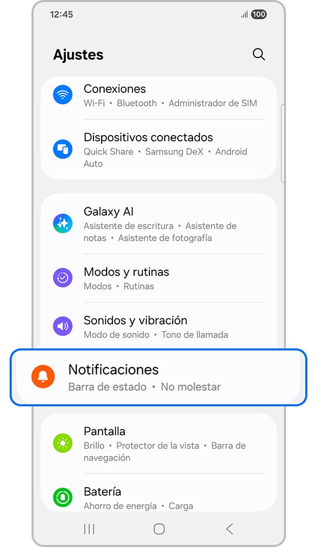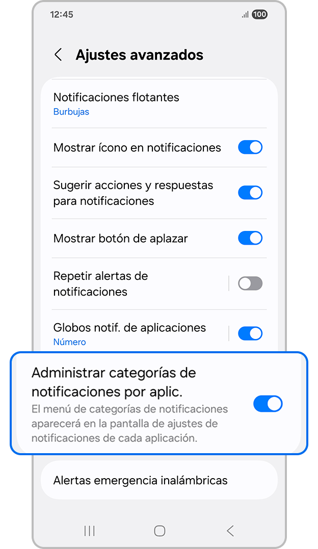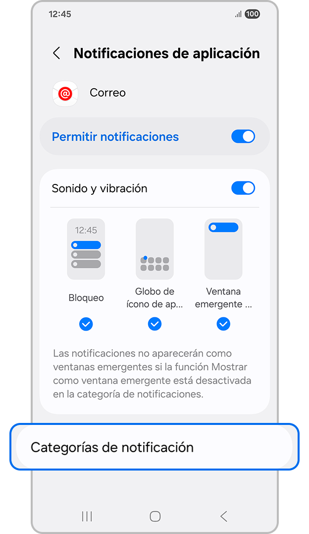 - Las opciones varían según la aplicación. Algunas aplicaciones no tienen la sección Categorías de notificaciones.