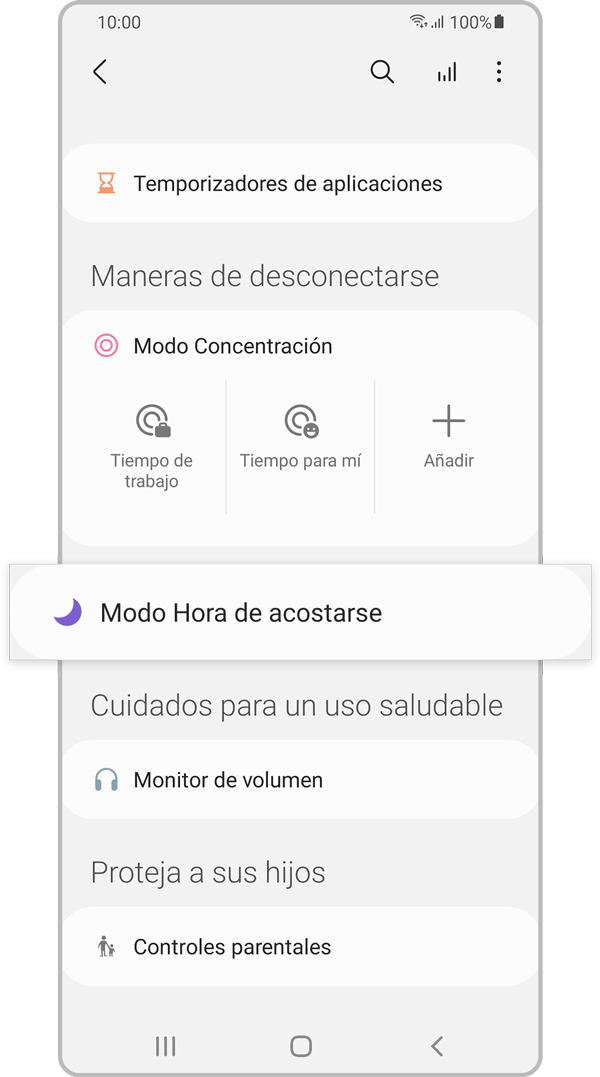 - Es posible que el modo Hora de dormir no sea compatible según el dispositivo, y el nombre del menú puede ser Desconectar.